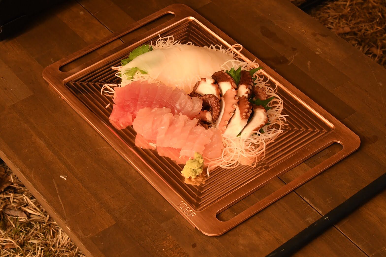 Mくんが刺し身をさばいてくれ『Vigor』の銅プレートに盛り付け。